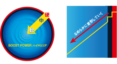 これは特許技術のブーストパワーテクノロジーを採用し、コアだけでなくボール全体が内柔外硬設計で、インパクト時のパワーを効率的に飛びに変えるのが特徴。